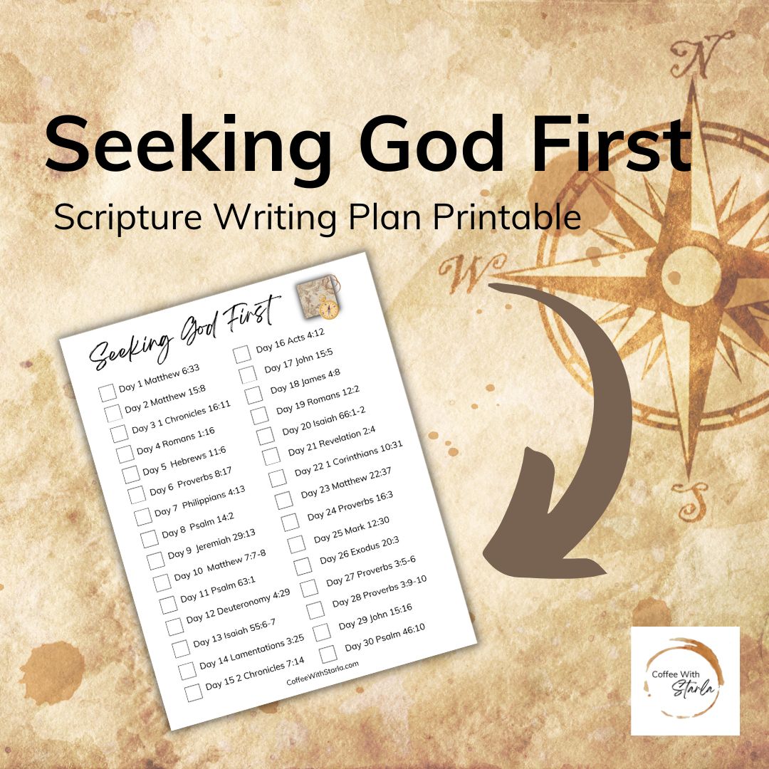 Use this Seeking God First scripture over the next 30 days to help you grow in your faith and relationship with God. Take one passage a day to read and write out. Grab the accompanying journal! Only one free product per month, per person is allowed. For personal use only. Do not make copies.