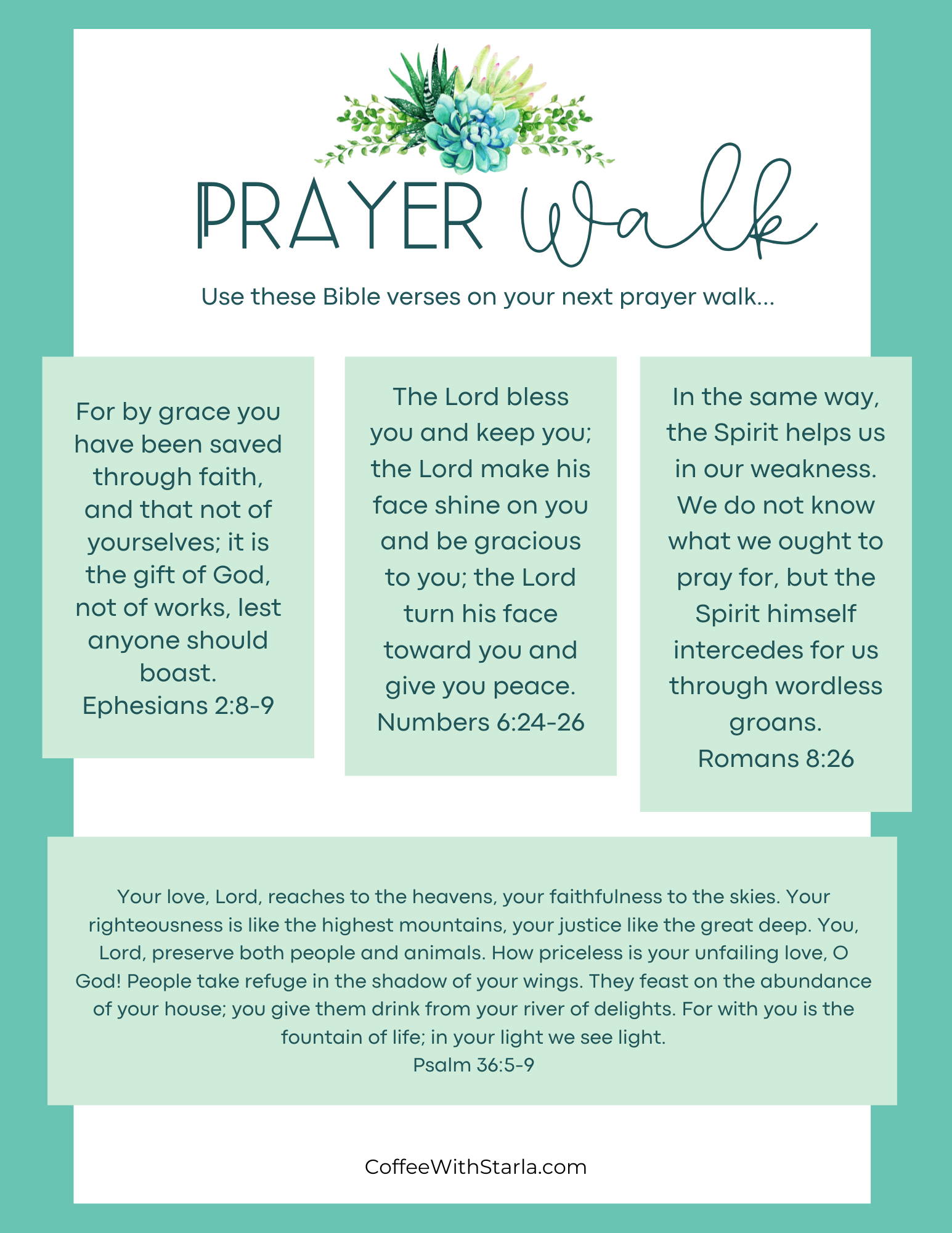 Grab this one page printable of Bible verses to read and pray as you go on your next prayer walk. Do not make copies. For personal use only.